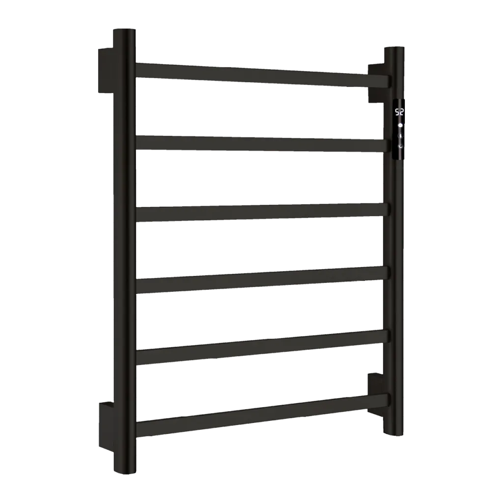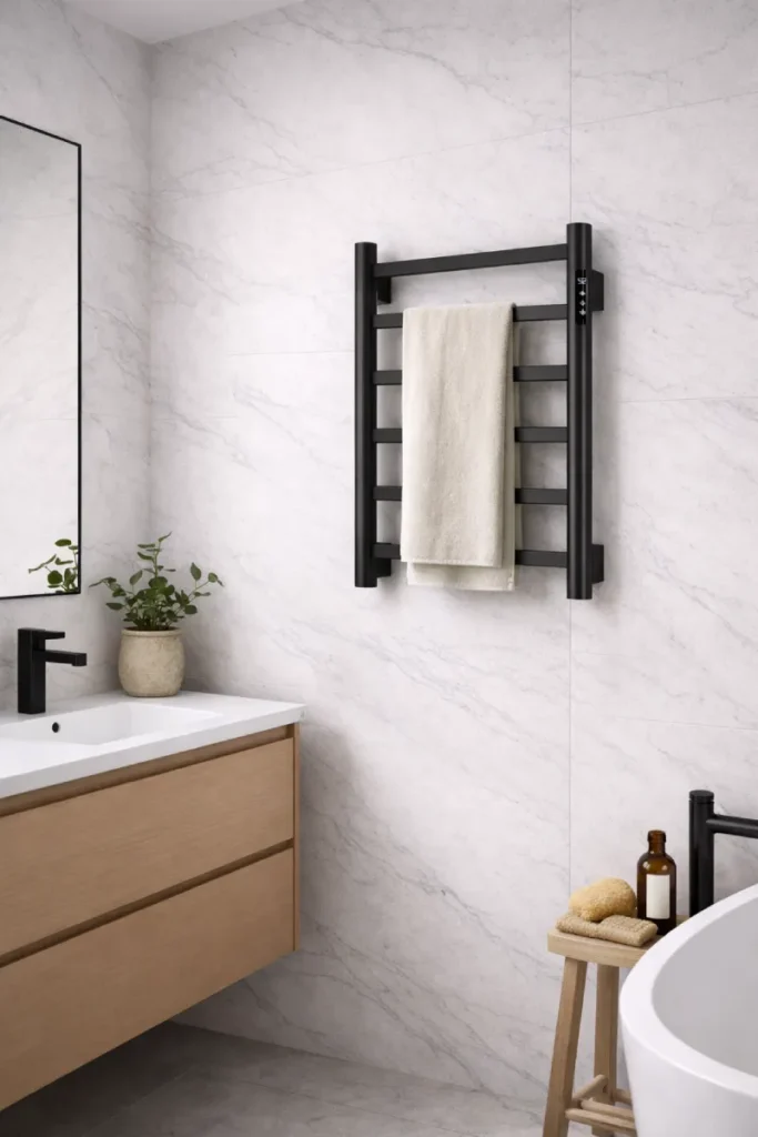 מחמם מגבות קומפקטי בגימור שחור מט, שמוסיף לאמבטיה פתרון חימום מסודר ומראה מינימליסטי חד. המבנה המדורג מאפשר תלייה נוחה של מגבות ידיים או מגבות גוף בלי לתפוס הרבה מקום, והגוון השחור משתלב מצוין עם בטון, אבן טבעית ולבן נקי למראה מודרני ומדויק.